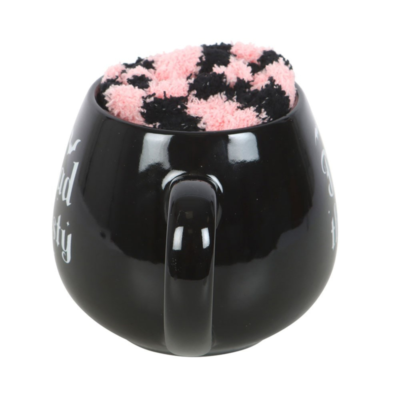Stay cosy with this playful ceramic mug and socks set, featuring a Dead Thirsty slogan and a fun pink and black gothic design. Ideal for gifting, this set is perfect for tea lovers who appreciate a quirky touch. 500ml. Microwave and dishwasher safe. Part of the Pretty Deadly collection.