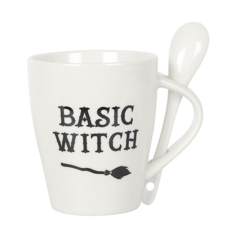 This bewitching mug and spoon set will add a pinch of magic to every cuppa. Style features 'Basic Witch' text and matching teaspoon with a mystical moon and star design that fits perfectly in a slotted handle. 300ml capacity. Dishwasher and microwave safe. Part of the Black Magic collection of gothic gifts and homeware.