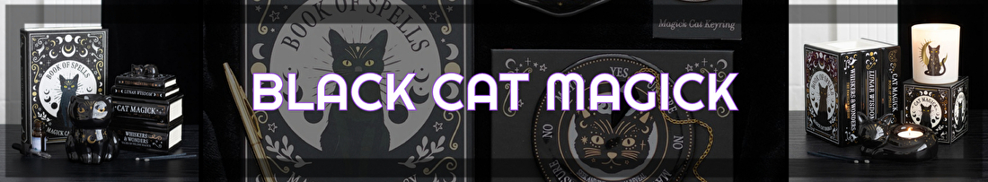 Black Cat Magick is geïnspireerd door folklore rondom zwarte katten, occulte symboliek en hemelse ontwerpen. Het assortiment omvat opbergdozen in de stijl van spreukenboeken, mokken, kaarsen en heksenaccessoires.