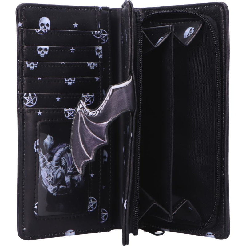 The purse is made from high-quality faux leather and showcases intricately embossed artwork, including pentacle motifs and the horned, winged Lucifly in vivid detail. Designed for both form and function, it includes a zip-around closure, internal card slots, a coin section, and a stylishly compact shape that you will love for everyday use.